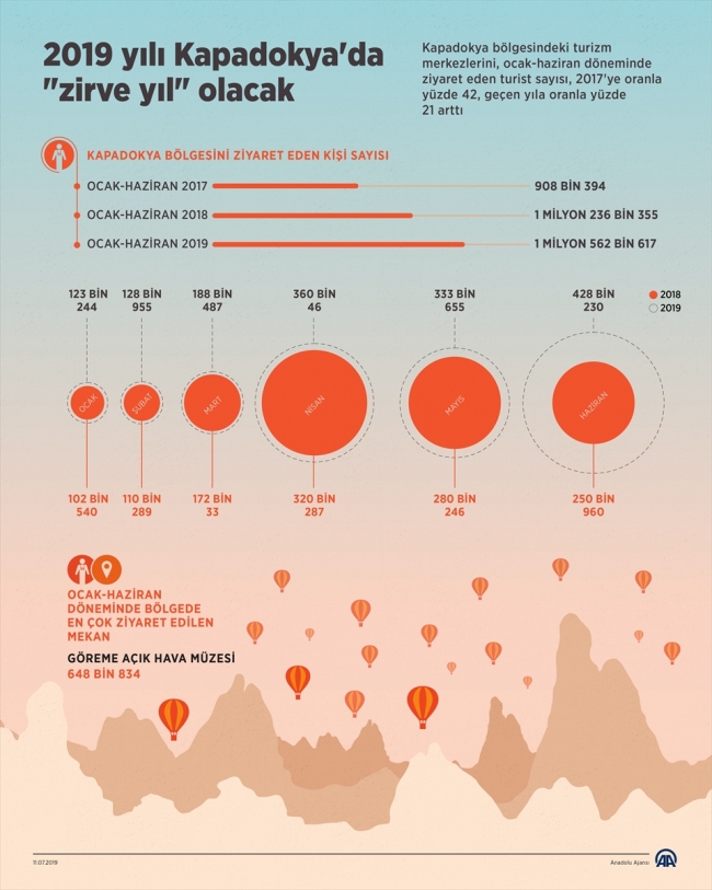 Kapadokya'daki aynı alanları, ocak-haziran döneminde 2017'de 908 bin 294, 2018'de ise 1 milyon 236 bin 355 turist gezdi.