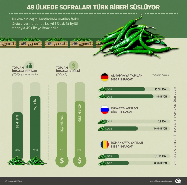Uludağ İhracatçı Birlikleri'nden (UİB) alınan bilgiye göre Akdeniz, Ege ve Marmara bölgeleri başta olmak üzere Türkiye'nin çeşitli kentlerinde üretilen farklı türdeki yeşil biber, bu yıl 1 Ocak-15 Eylül itibarıyla 49 ülkeye ihraç edildi.