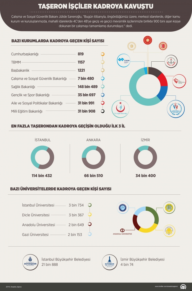 "Sadece 4 bakanlığımızdaki kadroya geçen sayısı 255 bin 565'tir. Diğer bakanlıklarımız, özel bütçeli kuruluşlarımızla birlikte, belediyelerimizle birlikte bu rakam 900 bini aşmıştır. En fazla taşerondan kadroya geçişin olduğu ilimiz İstanbul, bu bağlamda 114 bin 432 kardeşimizin kadroya geçiş işlemi yapıldı. Ankara'da 66 bin 510, İzmir'de de 34 bin 400 kişinin dün itibarıyla kadroya geçiş işlemleri tamamlanmış durumda."