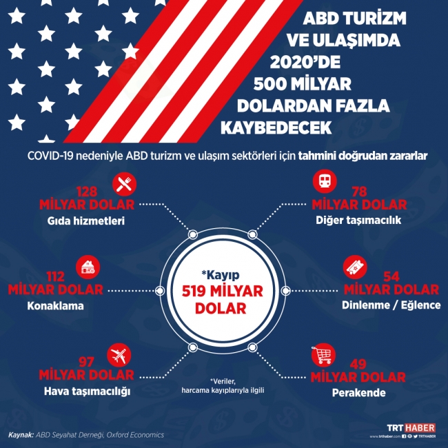 Rapora göre, ABD'nin bu yılki doğrudan seyahat harcamalarında 519 milyar dolarlık düşüş yaşanacağı tahmin ediliyor. Bunun ekonomik çıktıda 1,2 trilyon dolarlık zarara dönüşmesi öngörülüyor. Yani, El Kaide terör örgütünün 11 Eylül 2001’deki saldırılarından 9 kat daha kötü bir finansal etki söz konusu.