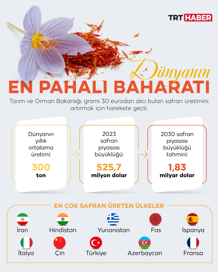 Dünyada safran yetiştiren ülkeler, bu baharattan çok yüksek döviz girdisi sağlıyor. Dünyada en çok safran üretimi İran’da gerçekleştirilirken, bu ülkeyi Hindistan ve Yunanistan takip ediyor.