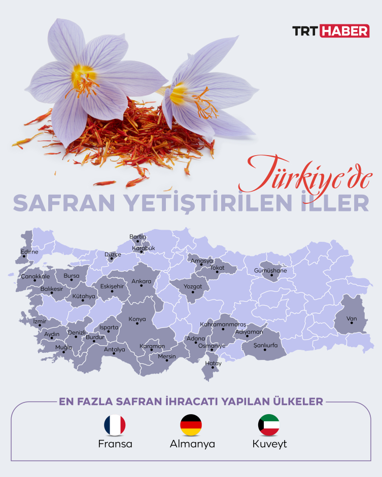 Türkiye’de yaklaşık 500 dekar alanda safran üretimi yapılıyor. 2023 yılında Türkiye, bin 36 ton safran ithal ederken, 3 bin 406 ton ihraç etti. 2024’te ise ilk 8 ayda ithalat 641 ton, ihracat ise 2 bin 679 tonu buldu. Türk safranına en büyük talep Fransa, Almanya ve Kuveyt’ten geldi.