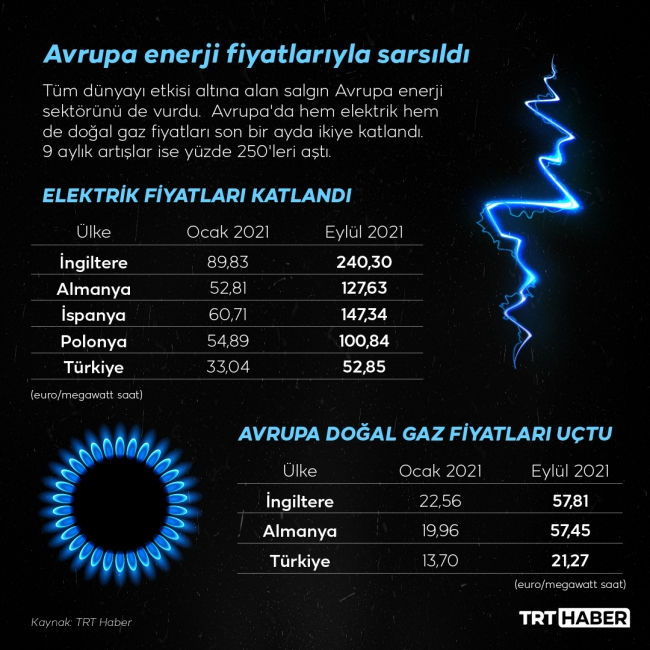 İngiltere doğal gaz ticaret merkezinde ocak ayında megawatt saat başına 22,56 euro olan doğal gaz birim fiyatı eylülde 57,81'e yükseldi. Doğal gaz fiyatları ilk dokuz ayda Almanya'da yüzde 300, Hollanda'da yüzde 270'in üzerinde arttı.