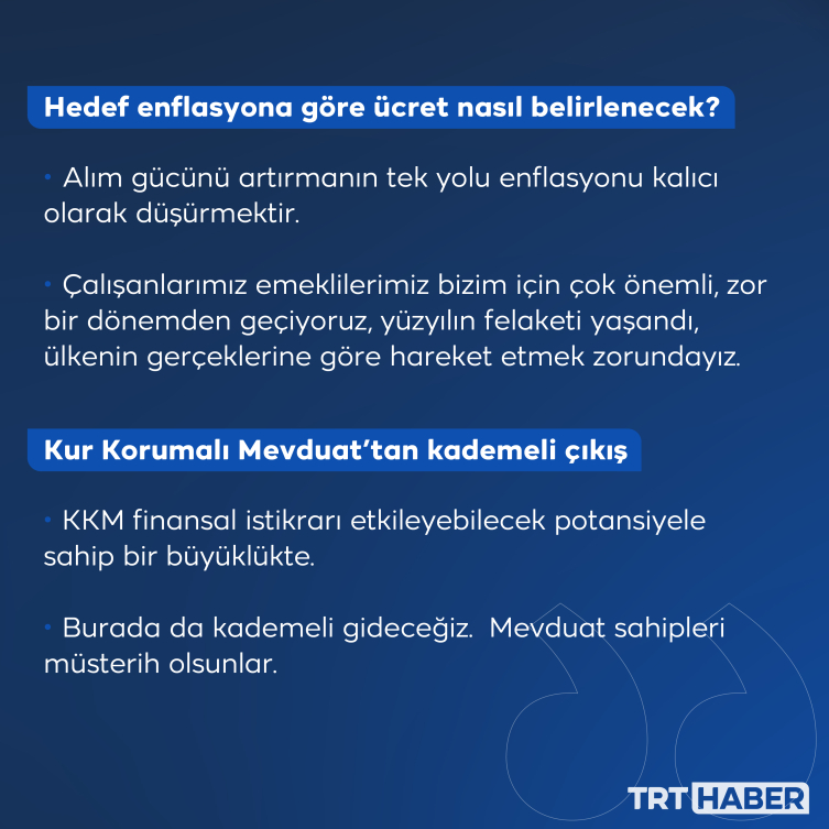 "Büyümeyi 1 puan daha yükseltmeyi verimlilik artışı ve fiyat istikrarıyla yaparız. Çalışanların alım gücünü enflasyonu düşürerek koruruz. Enflasyonla mücadele tüm iş dünyasının, sendikaların ve vatandaşların sabır ve kararlılıkla destek vermesi gereken bir programdır. Gerçekçi hedefler ortaya koyduk. Hiçbir kesimi enflasyona ezdirmeyeceğiz, bu bizim taahhüdümüz. En düşük maaş alan emeklilerin durumunun iyileştirilmesine yönelik, Cumhurbaşkanımızın bize talimatı oldu, bu çalışmaları yapıyoruz. O konuda da çok netiz. Burada önemli olan, toplumun bütün kesimlerini enflasyona karşı korumamız."