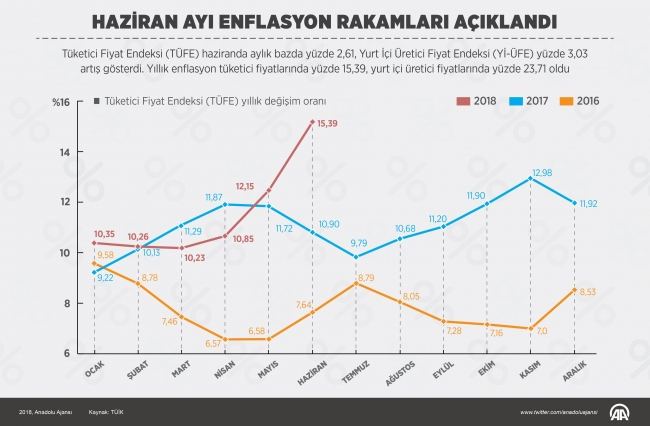 TÜFE, haziranda geçen yılın aralık ayına göre yüzde 9,17, geçen yılın aynı ayına göre yüzde 15,39 yükseldi. Yİ-ÜFE ise Aralık 2017'ye göre yüzde 15,52, geçen yılın haziran ayına kıyasla da yüzde 23,71 arttı.
