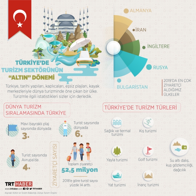 2018'de 46 milyondan fazla turistin tercih ettiği Türkiye'yi, 2019'da 52,5 milyon turist ziyaret etti. Böylece turist sayısı geçen yıla göre yüzde 14,4 arttı.