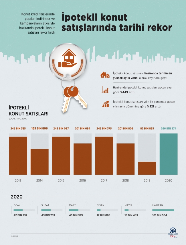 Salgına yönelik endişelerin ve vaka sayılarının en üst seviyeye çıktığı nisan ayında 17 bine kadar gerileyen ipotekli konut satış sayısı, alınan önlem ve tedbirlerin etkisiyle yükselişe geçerek haziranda 101 binin üzerine çıktı. Böylece ipotekli konut satışı bu yılın ilk yarısında geçen yılın aynı dönemine göre yüzde 221 artarak 266 bin 374'e ulaştı. Bu rakam son 8 yılın en iyi ilk yarı performansı olarak kayıtlara geçti. Geçen yılın ilk yarısında 82 bin 885 ipotekli konut satılmıştı.