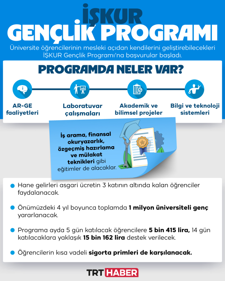 "Mesleki deneyim ve gelir elde etmek isteyen, üniversite okuyan genç kardeşlerimizin başvurularını bekliyoruz. Sevgili gençler bu fırsatı kaçırmayın" diyerek çağrı yapan Bakan Işıkhan, "İŞKUR Gençlik programımız, devlet üniversitelerinde okuyan öğrencilerimiz için hazırladığımız, teorik ve pratik eğitimlerin verildiği, kısmi zamanlı bir aktif iş gücü programıdır. Bu programla siz sevgili gençlerimiz hem deneyim kazanacaksınız hem de çalışma hayatına daha hazırlıklı olacaksınız. Kendi kampüsünüzde eğitiminize ara vermeden katılabileceğiniz bu programla üniversitenizde bilimsel projelerde, laboratuvar çalışmalarında, sürdürülebilir kampüs faaliyetlerinde, kütüphane hizmetlerinde ve daha birçok önemli alanda yer alabileceksiniz." ifadelerini kullandı.