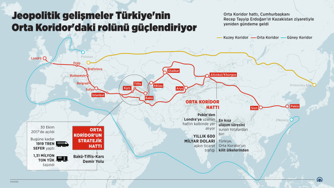 Tarihi İpek Yolu'nun canlandırılması için stratejik önem taşıyan ve Türkiye'den başlayarak Kafkaslar'a, oradan da Hazar Denizi'ni aşarak Türkmenistan ve Kazakistan'ı takiben Orta Asya ve Çin'e ulaşan Orta Koridor'un önemi her geçen gün artıyor.