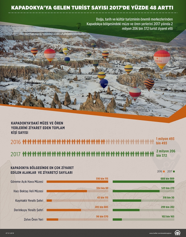 Peribacaları, kayadan oyma manastırları, tarihi yer altı yerleşimleri ve mağara otelleri ile konuklarına masalsı bir tatil imkanı sunan, sıcak hava balon turlarıyla görkemli manzaranın kuş bakışı izlenebildiği Kapadokya'da, turist sayısı 2017'de bir önceki yıla göre yaklaşık yüzde 48 artış gösterdi.