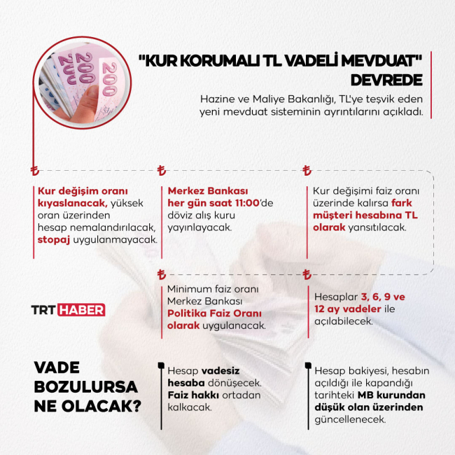 Hazine ve Maliye Bakanlığından yapılan yazılı açıklamada, birikimlerini TL mevduat olarak değerlendiren vatandaşların kurlardaki oynaklık karşısında mağdur olmaması için "Kur Korumalı TL Vadeli Mevduat" ürününün devreye alındığı belirtildi.