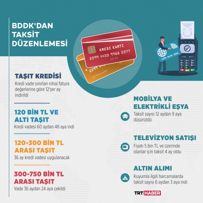 BDDK'dan yapılan açıklamaya göre, kredi kartlarında taksitlendirme sürelerinin, basılı ve külçe halinde olmayan kuyumla ilgili harcamalarda 6 aydan 3 aya, mobilya ve elektrikli eşya alımlarında 12 aydan 9 aya indirilmesine karar verildi.