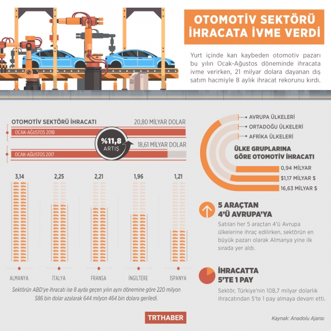 Otomotiv Distribütörleri Derneği (ODD) ve Türkiye İhracatçılar Meclisi (TİM) verilerine göre, yılın 8 ayında geçen yılın aynı dönemine kıyasla Türkiye otomobil ve hafif ticari araç pazarı yüzde 21 daralırken, bu dönemde otomotiv endüstrisi 20 milyar 808 milyon 307 bin dolarlık ihracat gerçekleştirdi.