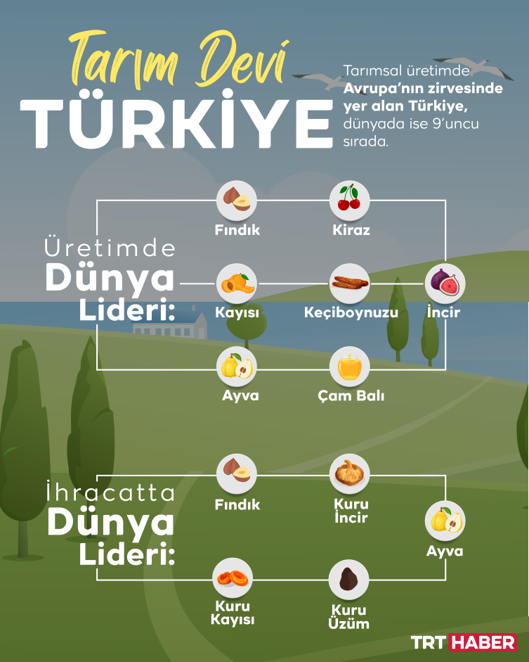 Fındık, kiraz, incir, kayısı, ayva, keçiboynuzu üretiminde ve fındık, kuru kayısı, kuru incir, kuru üzüm ve ayva ihracatında da dünyanın zirvesinde yer alıyoruz.