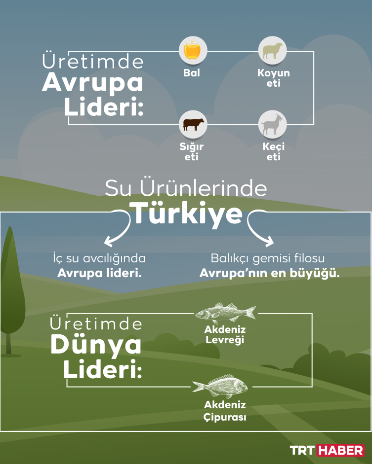 Dünyada buğday unu üretiminde de 1’inci sırada yer alan Türkiye, Akdeniz levreği, Akdeniz çipurası üretiminde de dünyada 1’inci sırada yer alıyor.