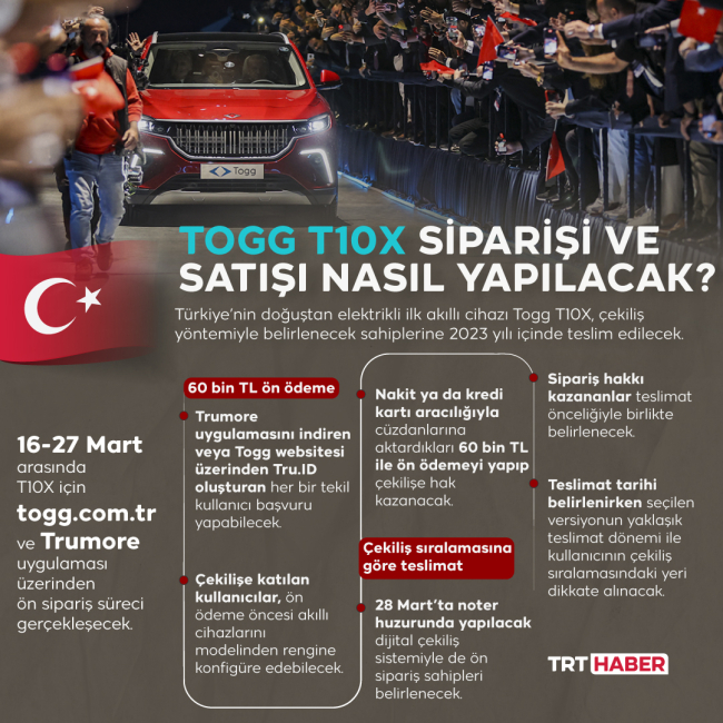 16-27 Mart arasında T10X için togg.com.tr ve Trumore uygulaması üzerinden ön sipariş süreci gerçekleşecek.