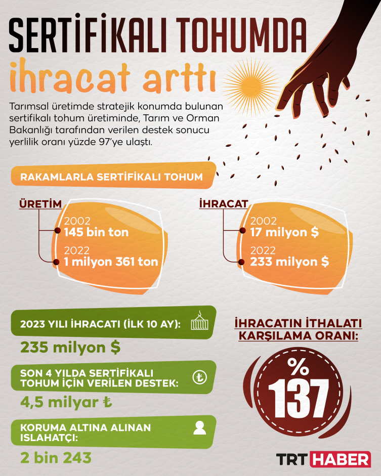 Sertifikalı tohum üretimi 2002 yılında 145 bin ton iken, 2022 sonunda 9,4 katlık artışla 1 milyon 361 bin tona yükseldi. Tohum ihracatı ise son 20 yılda 13,7 kat artarak 17 milyon dolardan 233 milyon dolara ulaştı. 2002 yılında 55 milyon dolar olan tohum ithalatı ise 2022 sonunda 170 milyon dolarda kaldı.