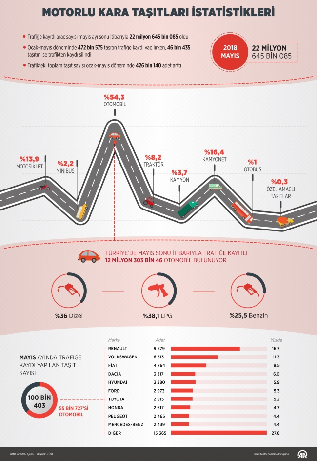 Buna göre, Mayıs sonu itibarıyla trafiğe kayıtlı toplam taşıt sayısı, geçen yılın aynı ayına göre yüzde 5 artarak 21 milyon 556 bin 827'den 22 milyon 645 bin 85'e yükseldi. Bu araçların yüzde 54,3'ünü otomobil, yüzde 16,4'ünü kamyonet, yüzde 13,9'unu motosiklet, yüzde 8,2'sini traktör, yüzde 3,7'sini kamyon, yüzde 2,2'sini minibüs, yüzde 1'ini otobüs, yüzde 0,3'ünü ise özel amaçlı taşıtlar oluşturdu.