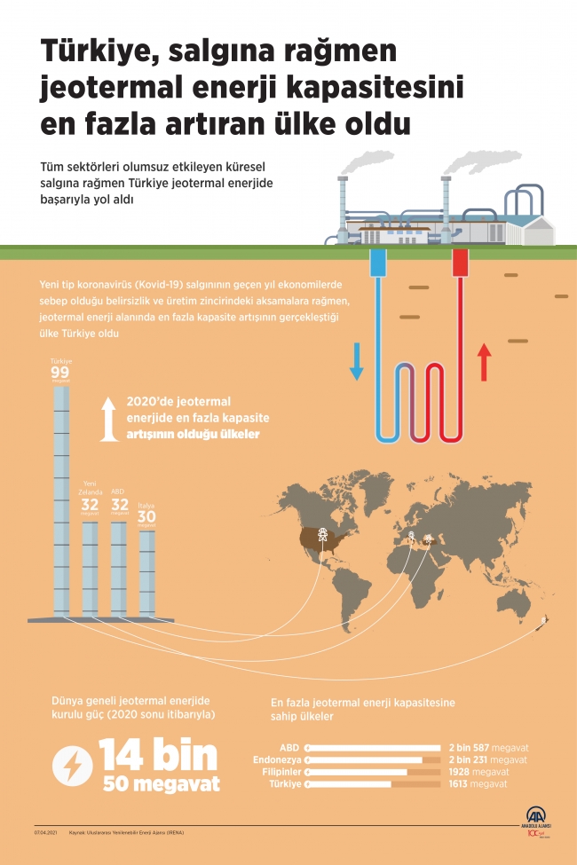 Yeni tip koronavirüs salgınının geçen yıl ekonomilerde sebep olduğu belirsizlik ve üretim zincirindeki aksamalara rağmen, jeotermal enerji alanında en fazla kapasite artışının gerçekleştiği ülke 99 megavat ilave güçle Türkiye oldu.