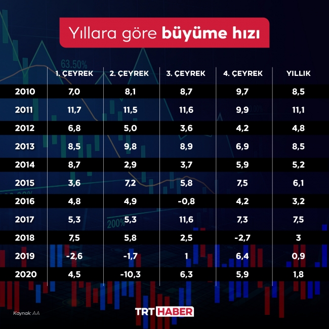 Buna göre, Türkiye ekonomisi 2020'de yüzde 1,8, geçen yılın son çeyreğinde yüzde 5,9 büyüme kaydetti.