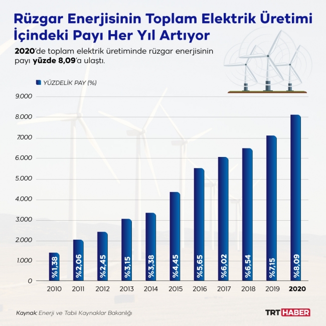 Rüzgar için özellikle son zamanlarda önemli yatırımlar yapılıyor. Öyle ki Türkiye, rüzgar enerjisine en fazla yatırım yapan beş Avrupa ülkesinden biri oldu. Son 10 yıllık veriler de rüzgar enerjisine ne kadar önem verildiğini kanıtlar nitelikte. Türkiye’de 2010’da bin 320 megavat olan kurulu güç 2020’de 8 bin 832 megavata kadar ulaştı. Toplam elektrik üretimi içerisindeki payı ise yüzde 8,09’a yükseldi.
