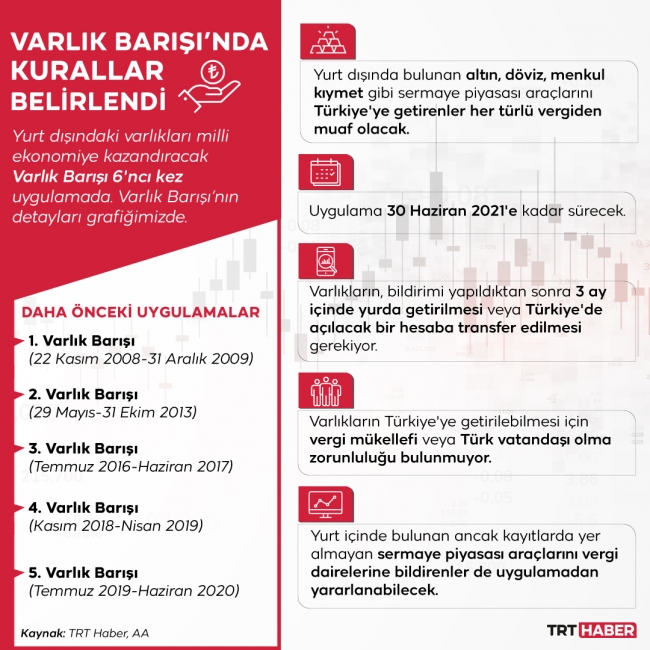 Yurt dışında bulunan para, altın, döviz, menkul kıymet ve diğer sermaye piyasası araçlarını, 30 Haziran 2021'e kadar Türkiye’deki banka veya aracı kurumlara bildiren gerçek ve tüzel kişiler, söz konusu varlıkları serbestçe tasarruf edebilecek.