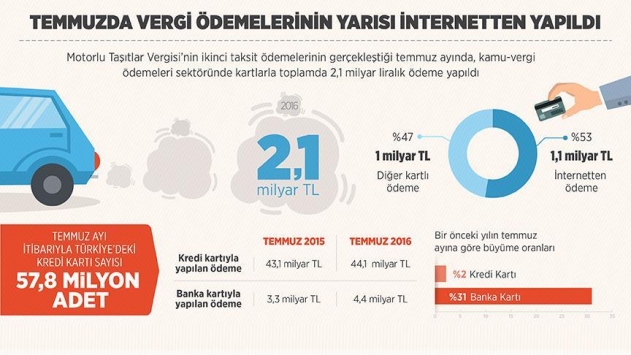 Verilere göre, kamu ve vergi ödemelerinin yüzde 53'ü geçen ay internetten yapıldı. 1,1 milyar TL'lik ödeme tutarı ile kamu-vergi, temmuz ayında internetten en fazla ödeme yapılan alan oldu.