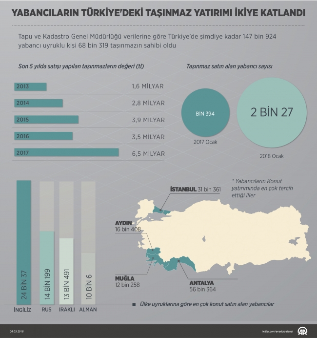 "Yabancı uyruklu kişiler, 2013'te 1 milyar 622 milyon 579 bin 540 lira, 2014'te 2 milyar 832 milyon 994 bin 677 lira, 2015'te 3 milyar 875 milyon 100 bin 523 lira, 2016'da 3 milyar 493 milyon 724 bin 531 lirasını Türkiye'den taşınmaz edinimi için harcadı. 2017'de ise bu rakam neredeyse iki katı artarak 6 milyar 534 milyon 761 bin 466 liraya ulaştı."