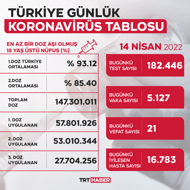 Buna göre, Türkiye'de son 24 saatte 182 bin 446 test yapıldı, 5 bin 127 kişinin testi pozitif çıktı.