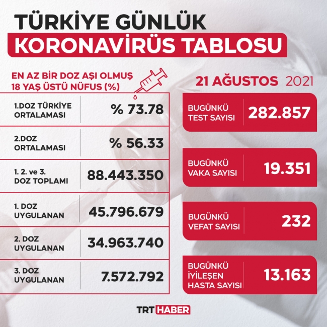 Türkiye'de son 24 saatte 282 bin 857 COVID-19 testi yapıldı, 19 bin 351 kişinin testi pozitif çıktı, 13 bin 163 kişi iyileşti, 232 kişi hayatını kaybetti.