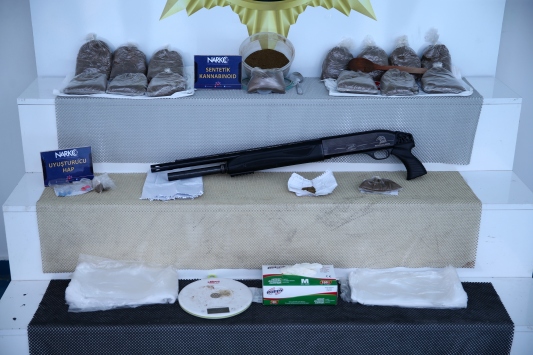 Adreste yapılan aramada, 3 kilo 795 gram sentetik kannabinoid, 7 uyuşturucu hap, bir av tüfeği ve uyuşturucu satışından elde edildiği değerlendirilen 7 bin 140 lira bulundu.