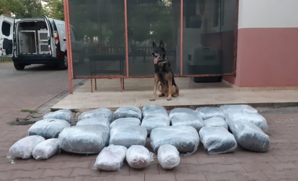 Motosiklette narkotik dedektör köpeği "Marco" ile yapılan aramada, eşyaların altına gizlenmiş 24 pakette 77 kilo 450 gram esrar bulundu.