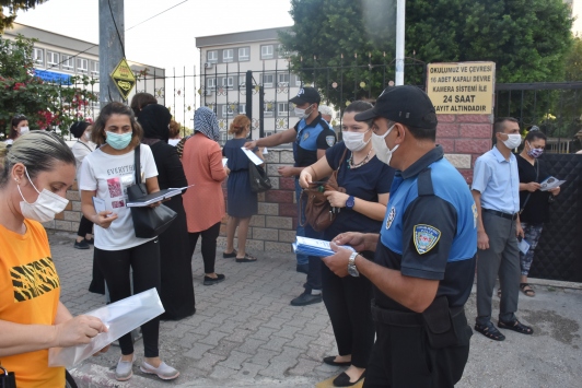 Öğrenci ve velilere Kovid-19 salgınıyla ilgili bilgiler aktaran ekipler, korunma yolları içeren broşürler ve maske dağıttı.