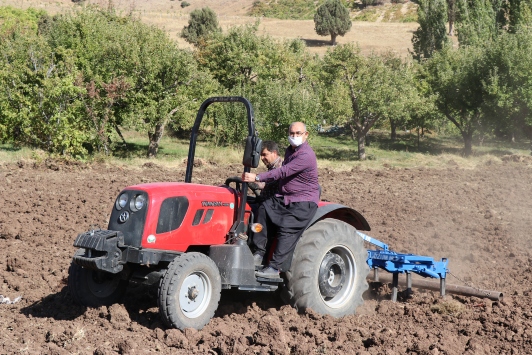 Çay, ilçeye bağlı Yazıcak Mahallesi'nde bulunan 6 dönümlük belediye arazisinde eşi, çocuğu ve kayınpederinin yanı sıra başkan yardımcısı ve birim müdürleriyle buğday tohumlarını toprakla buluşturdu.