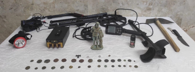 Zanlılardan E.K'nin aracı ve evinde, Roma dönemine ait olduğu değerlendirilen bronz savaşçı heykelciği, 30 sikke, 4 obje, 2 dedektör cihazı, kazma ve biber gazı ele geçirildi.