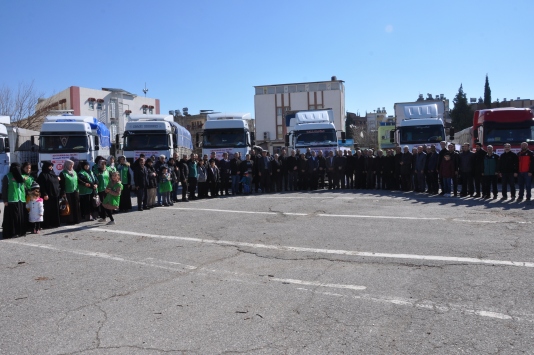 Konuşmanın ardından yardım tırları, dualar eşliğinde bölgeye uğurlandı.