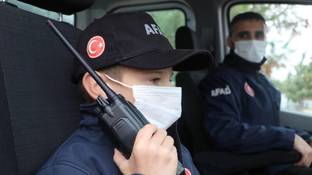 AFAD ekiplerini görünce çok sevinen ve hediye edilen üniformayı giyen Kerem, telsizden anons yaptı.
