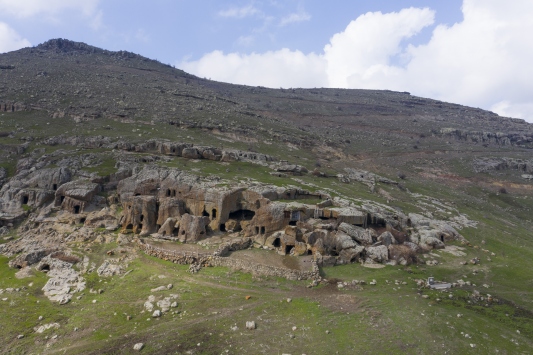 "Bininler Kaya Evleri" için yapılan tanıtım çalışmaları kapsamında günümüze kadar ayakta kalmayı başaran tarihi kaya yerleşimi, havadan görüntülendi.