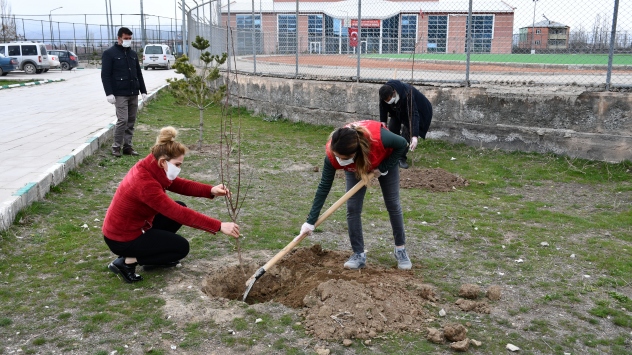 Doğubayazıt ilçesinde Gençlik Merkezi çalışanları ile gönüllü gençler, Kovid-19 tedbirleri kapsamında yapılan "Evde Kal Türkiye" çağrısına destek vermek için hayata geçirdikleri proje kapsamında, merkeze ait alanı ağaçlandırdı.
