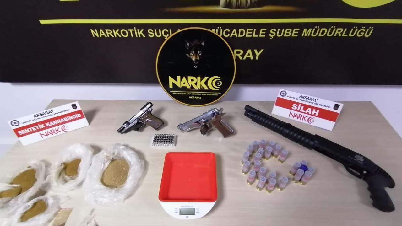 Şüphelilerin otomobil ve adreslerindeki aramada, bir miktar sentetik uyuşturucu, 2 kurusıkı tabanca ve av tüfeği ele geçirildi.