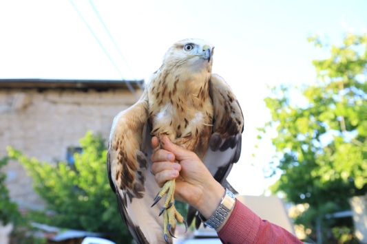 Kanadından yaralandığı için uçamayan şahinin yaşadığını anlayan vatandaş, durumu Aksaray Belediyesi ekiplerine haber verdi.