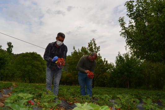 Sokağa çıkma kısıtlamasından muaf olan çilek üreticileri, imece usulü ile hasat yapıyor.