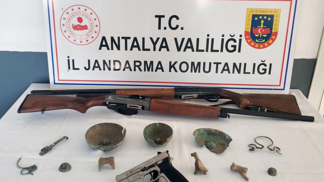 Manavgat İlçe Jandarma Komutanlığı ekipleri tarafından Sırtköy Mahallesi'nde bazı kişilerin tarihi eser kaçakçılığı yaptığı bilgisi üzerine araştırma başlatıldı. N.B. ve M.E.'nin tarihi eser kaçakçılığı yaptığı belirlendi. Manavgat Cumhuriyet Başsavcılığı koordinasyonunda, şüphelilerin evlerine baskın yapıldı. Evlerde Roma dönemine ait olduğu değerlendirilen 5 taş heykel, 11 taş obje, 3 bronz kap, 5 bronz su matarası ile 3 av tüfeği ve kurusıkı tabanca ele geçirildi. Gözaltına alınan N.B. ve M.E., işlemlerinin ardından serbest bırakıldı. Ele geçirilen tarihi eserler de incelenmek üzere Side Müze Müdürlüğü'ne teslim edildi.