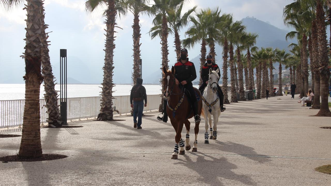 Atlı polisler de Konyaaltı Sahili'nde denetimlere destek verdi.