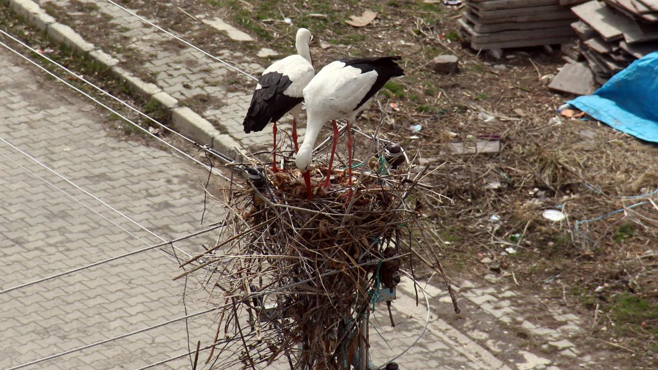 Özellikle elektrik direklerini mesken tutan leylekler, gün boyu doğadan topladıkları çalı ve otlara yuvalarını oluşturmaya başladı.