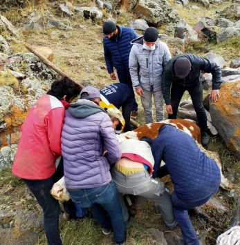 Gölün Cambaz köyü mevkisinde merada otlamaları için bırakılan hayvanlardan birinin kayalıklardan düştüğünü gören vatandaşlar, durumu AFAD'a bildirdi.