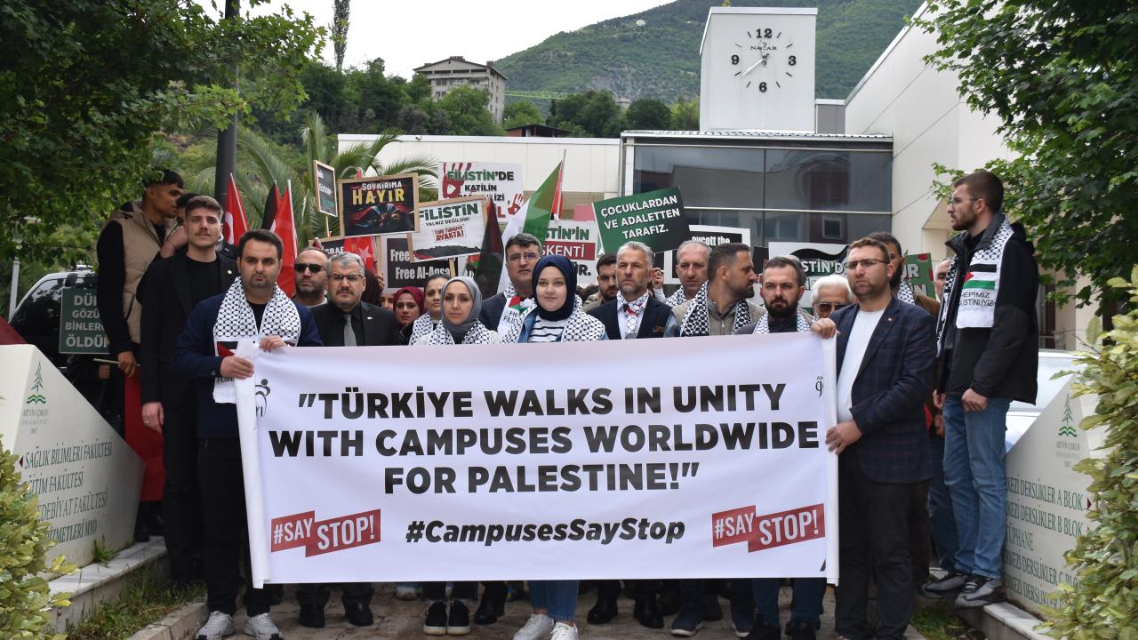 "Özellikle geçtiğimiz hafta ABD'nin New York kentindeki Columbia Üniversitesinde öğrencilerin ve akademisyenlerin katılımıyla başlayan İsrail karşıtı gösteriler, dünya genelinde onurlu duruşun başkaldırı fitilini ateşlemiştir. Bizler de Artvin Çoruh Üniversitesi öğrencileri olarak Gazzelilerin çığlıklarına kulak veren üniversite öğrencilerinin yanındayız. 81 ilimizde bulunan bütün üniversiteli kardeşlerimizi ve akademisyenlerimizi İsrail barbarlığına karşı durmaya, Gazzeli kardeşlerimizin yanında olmaya ve SayStop eylemlerimize ses vermeye davet ediyoruz."