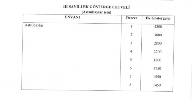 Astsubayların ek gösterge cetveli belli oldu. Yeni ek gösterge cetveline göre 1. derece astsubayların ek göstergesi 4200 oldu.
