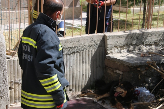 Kısa sürede olay yerine gelen itfaiye ekipleri, demir korkuluğu hidrolik makasla keserek köpeği sıkıştığı yerden kurtardı.