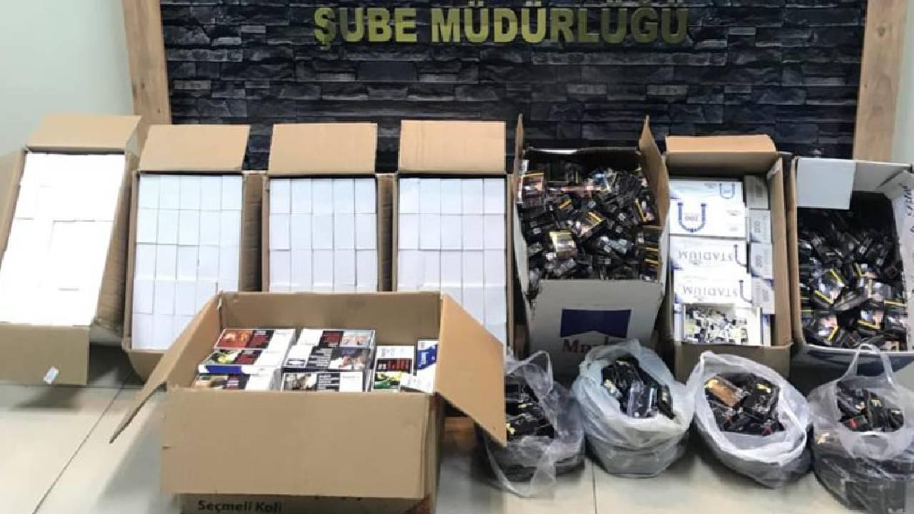 Ev ve iş yerlerinde yapılan aramada 10 bin 500'ü dolu 92 bin makaron, 30,5 kilogram tütün, 875 paket kaçak sigara, sigara sarma makinesi ve 60 kesilmiş bandrol ele geçirildi.